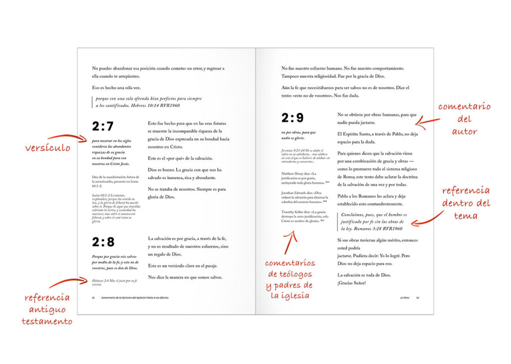 Este comentario de la epístola de Pablo a los Efesios es útil para el estudio bíblico individual o en grupo. Es un comentario versículo por versículo, con trasfondo histórico y cultural. Aparte del comentario del autor, al margen aparecen notas, referencias a textos del Antiguo Testamento y comentarios de otros teólogos o padres de la iglesia de siglos pasados sobre cada versículo. Ver imagen.